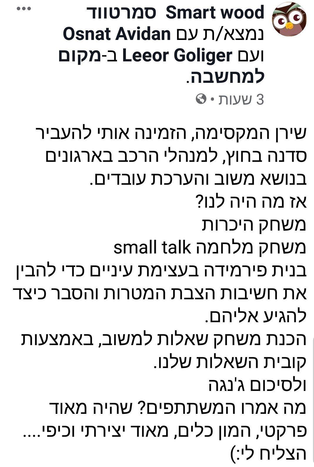 בעלת חברת Smartwood, מנחת קבוצות - סדנאות והרצאות באמצעות משחקי חברה וחשיבה מעץ